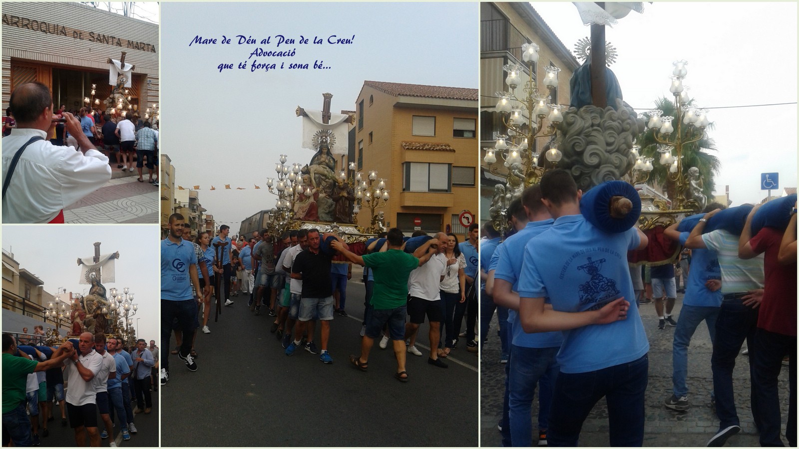 TRASLADO. Hoy miércoles 30 de septiembre a las 19'30 horas, tras la celebración de la eucaristía, el anda con la imagen de la Patrona de Puçol será trasladada hasta la parroquia de santa Marta. Un acto sencillo y lleno de significado, al unir las dos parroquias del pueblo en una misma devoción a la Mare de Déu al Peu de la Creu. Con tal motivo, la eucaristía de Santos Juanes se celebrará a las 19 horas. ¡Acompañemos todos a nuestra Madre en este abrazo de amistad y devoción entre las dos parroquias!