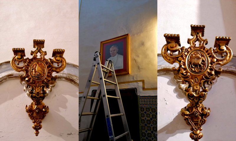 El viernes 15 de enero pudimos colocar el cuadro del papa san Juan Pablo II en el lateral del presbiterio. También colocamos en el espacio del Baptisterio dos candelabros de madera tallada procedentes de algún antiguo retablo, que llevan el simbolismo de los dos titulares de la parroquia: el águila de san Juan Evangelista, y el cordero de san Juan Bautista. Dos nuevas incorporaciones en el templo para recordar el fecundo ministerio del papa Juan Pablo y a los Santos Juanes, que son compañeros e intercesores de nuestra vida parroquial.