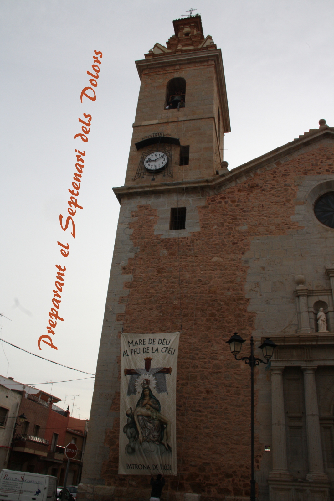 LA CARA EXTERNA DEL SEPTENARIO. Si ayer por la noche el presidente de la Cofradía y el rector de Santos Juanes pudimos tener una cena/reunión con los festeros y festeras 2016 de la Mare de Déu al Peu de la Creu para comentar las celebraciones del Septenario, hoy miércoles los profesionales de trabajos de altura están colocando en la fachada del templo parroquial un gran lienzo con la figura de la Patrona que anuncia lo que vamos a celebrar a partir del sábado 12 de marzo.