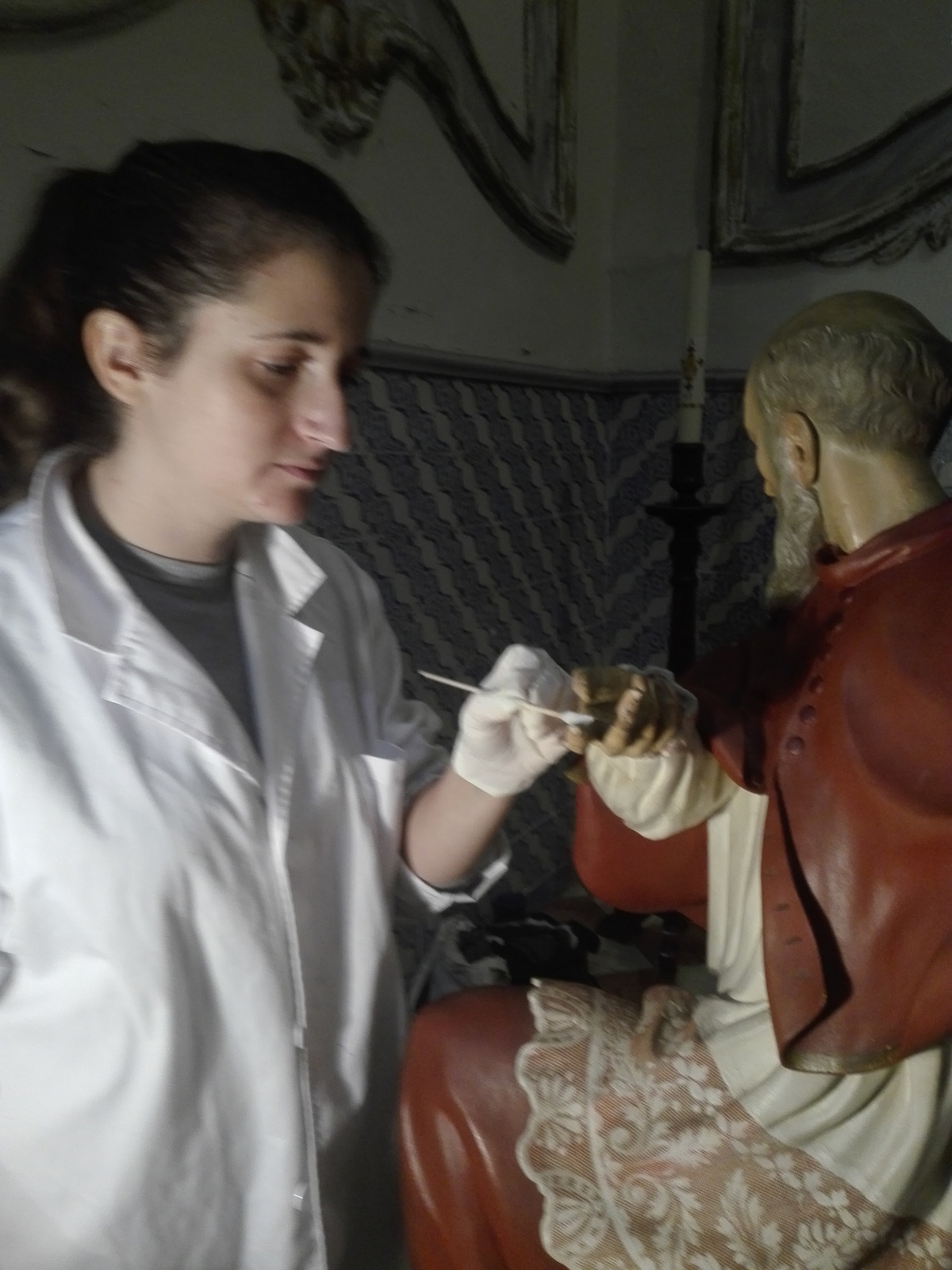 El conjunto escultórico de la Mare de Deú al Peu de la Creu está siendo restaurada por el Departamento de Restauración de la U.P.V. Los trabajos se realizan en el mismo templo parroquial por José M. Simón Cortés, junto al que hoy también estaban trabajando Laura y Teresa. Intervenciones sobre las imágenes de la Virgen con su Hijo, así como la de Juan de Ribera y Pedro Muñoz, que forman parte del conjunto, y que volverán a tener su policromía original.