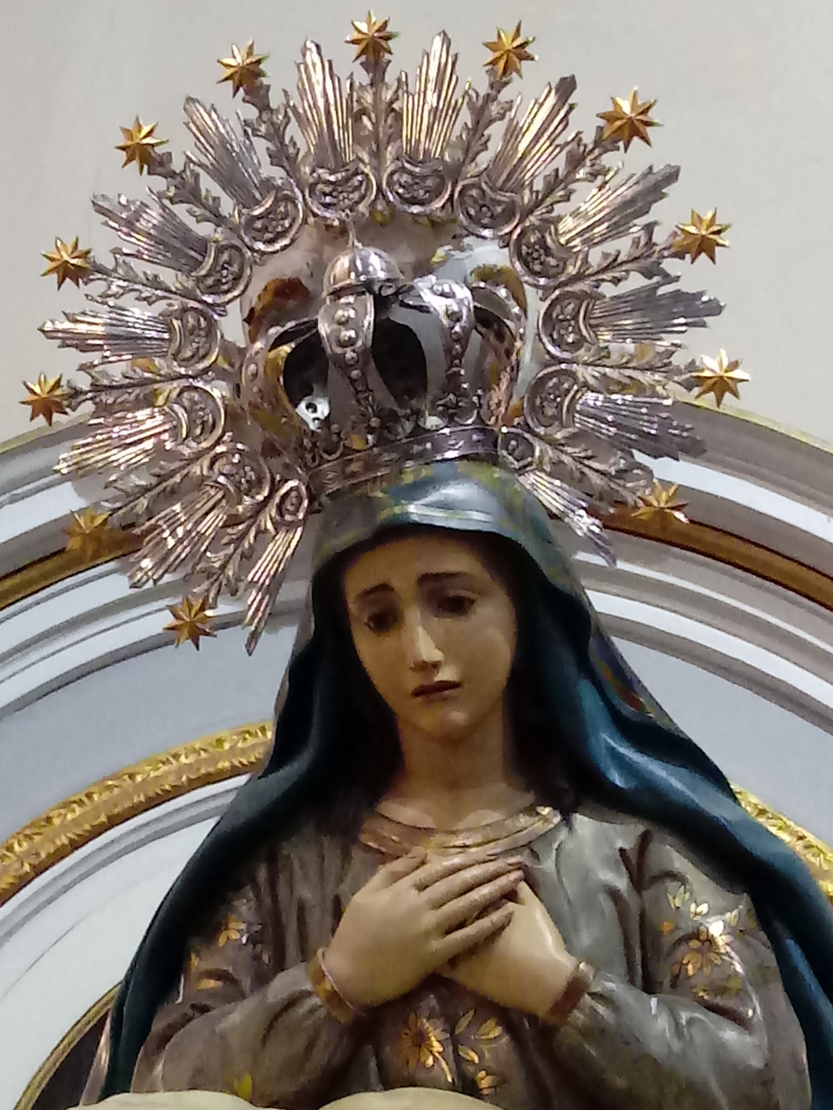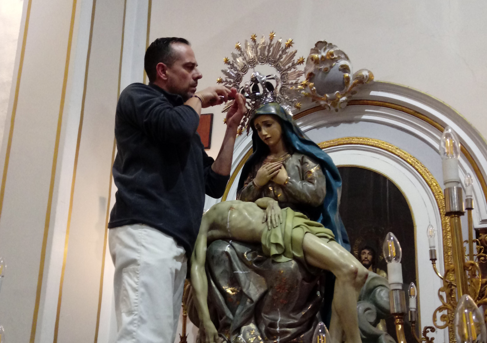 El proceso de la restauración de la imagen y anda de la Mare de Déu al Peu de la Creu progresa satisfactoriamente. El cuerpo de la imagen está ya en su fase final de restauración tras el laborioso trabajo de José, buen profesional y mejor persona. La corona, como evidencian las fotos, ya está siendo colocada tras su restauración. Queda la actuación sobe el anda, que será acometida en su momento. Se aprende mucho observando y escuchando a los expertos en el arte de la restauración. Seguiremos informando...